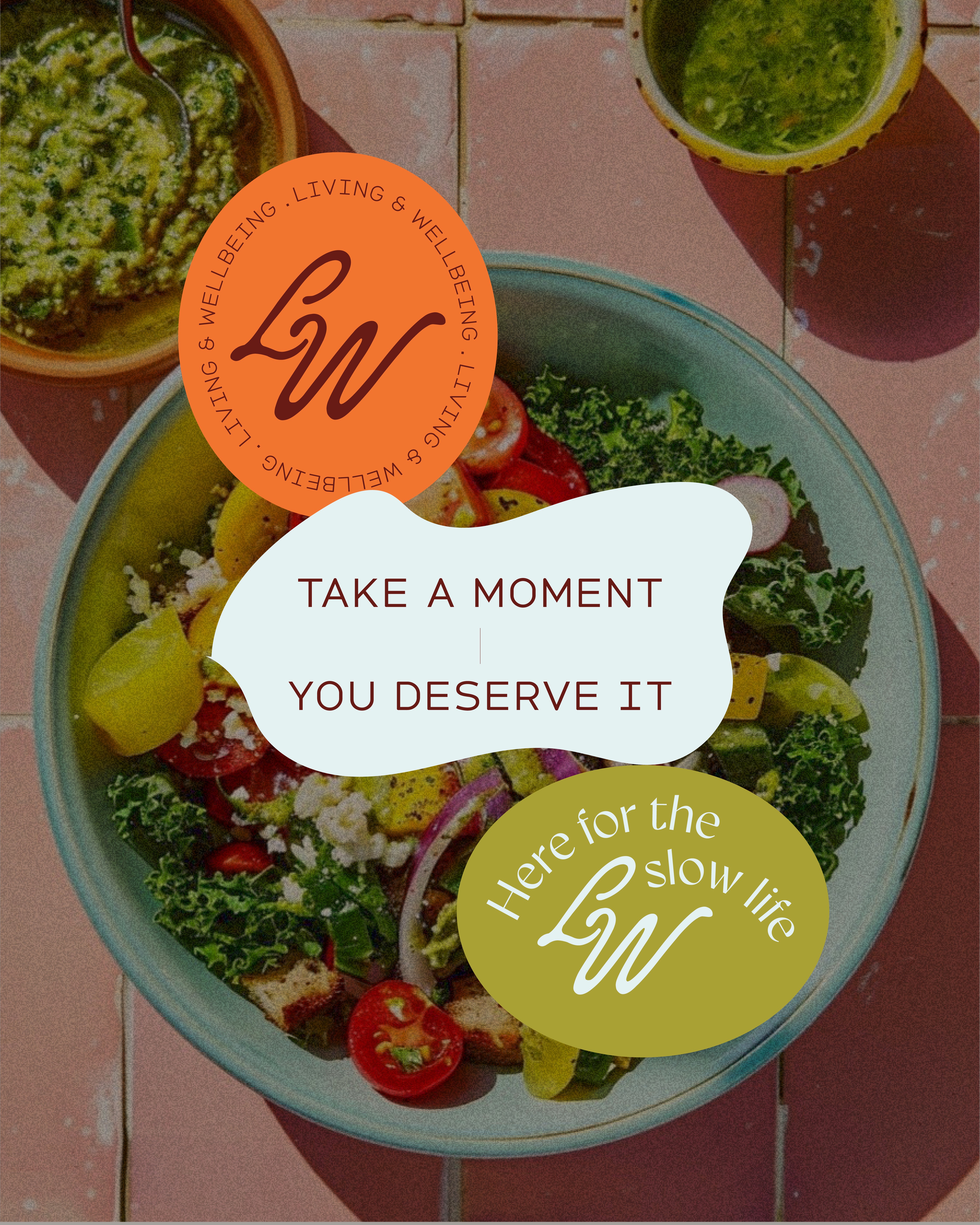 Rebranding for Living & Wellbeing, a healthy lifestyle brand designed as your safe space. A place for healthy food and mindful living essentials.The identity reflects the energy of healthy living, balanced with a soothing sense of connection to self.From the logo and submark design to colour palette, every element comes together as one cohesive lifestyle.